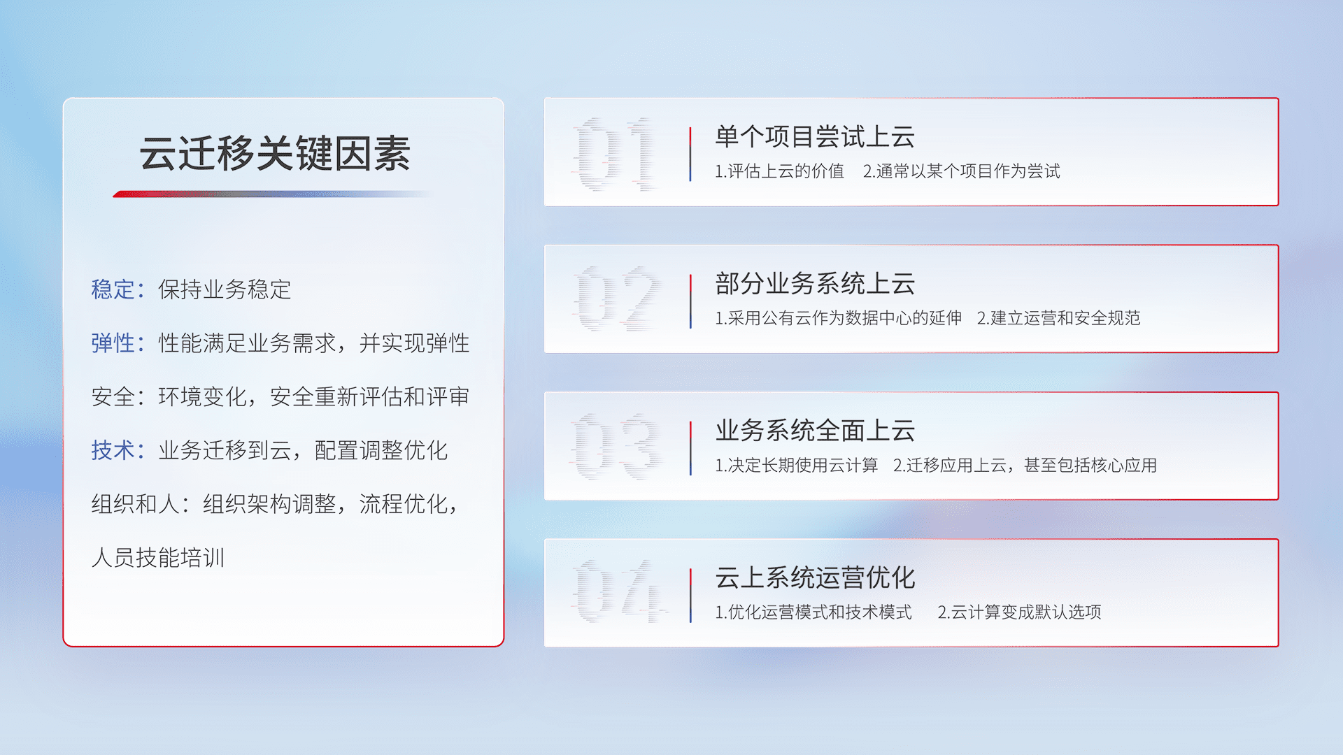 结合实际业务,,,从规划设计、、、云平台选型、、云原生改造、、、数据迁移、、集成交付,,,,迁移全过程为客户识别最佳上云路径,,,做好风险识别管理,,设计网络架构、、、身份权限、、、安全审计合规、、操作审计、、日志审计、、、监控告警策略、、多站点容灾设计等,,对云上基础设施进行整体规划,,,提升IT治理水平,,,以满足弹性、、、、高可用、、、、高性能的需求。。。